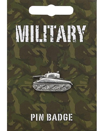 Product Description: This Sherman Tank pin badge is made from lead-free pewter and is supplied on a pin with separate clasp. The Sherman tank is an iconic American medium tank utilised during World War II. The pin badge is mounted on an information card that has a camouflaged background with the word "Military" on the front and has information about war and the special forces on the reverse.