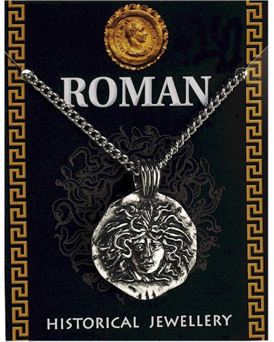 Product Description: This Roman Medusa pendant is made from lead-free pewter. The medusa pendant is supplied on a silver chain. Medusa was the most famous of the monster figures known as Gorgons. She was usually represented as a winged female creature having a head of hair consisting of snakes. The pendant is mounted on a fold-over information card, which has an image of a gold coin and the head of Medusa on the front with a key design down each side. On the reverse it describes how ornate Roman jewellery was initially rare and that it had influences from other cultures.